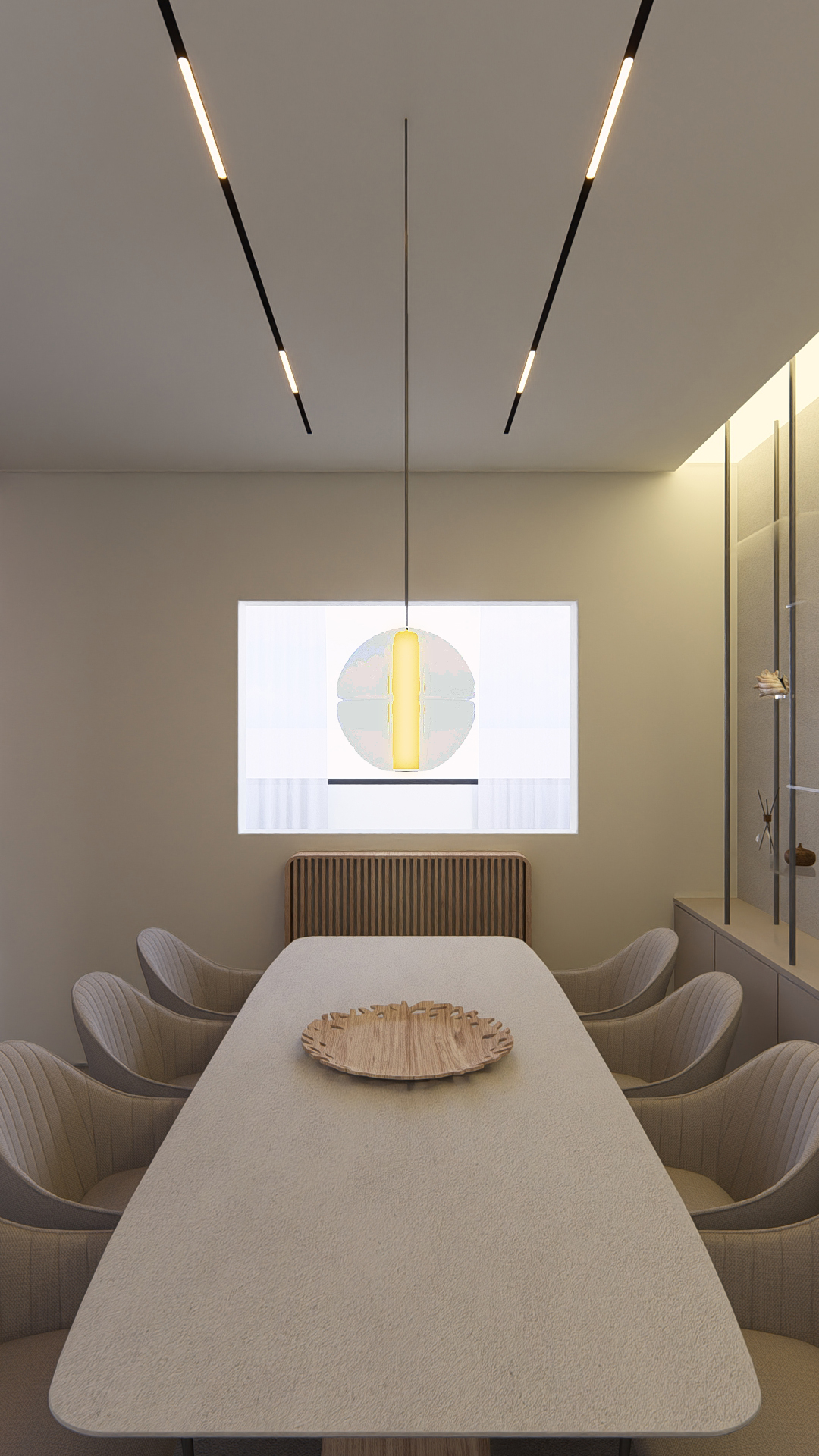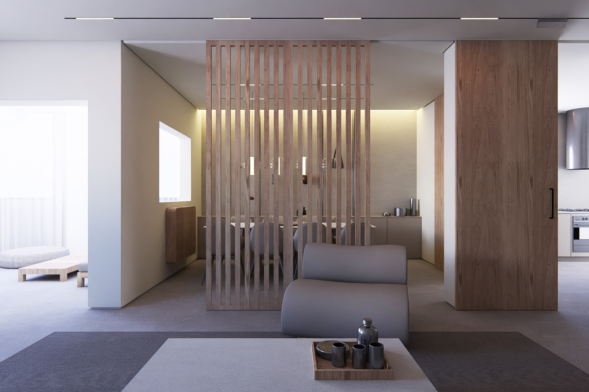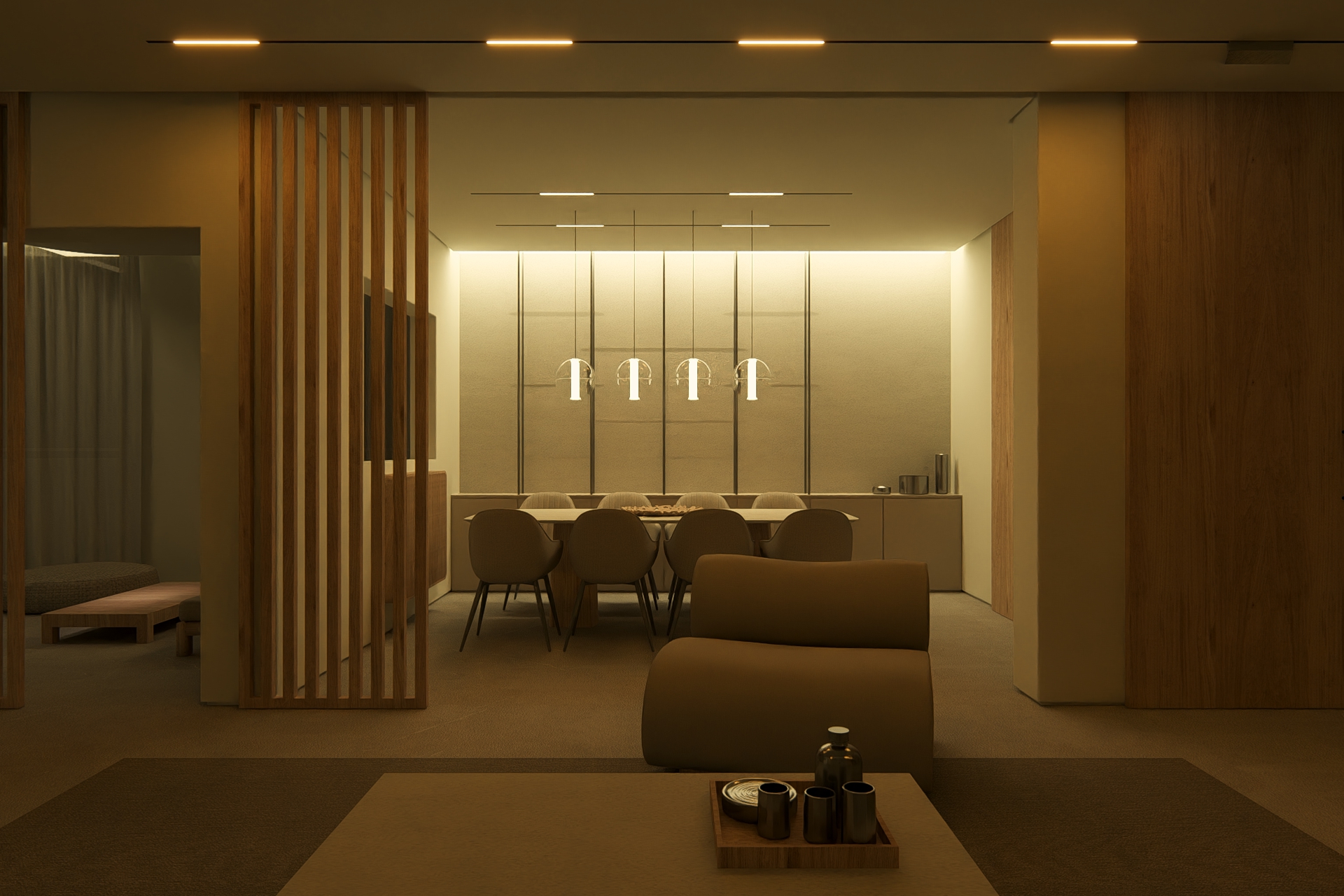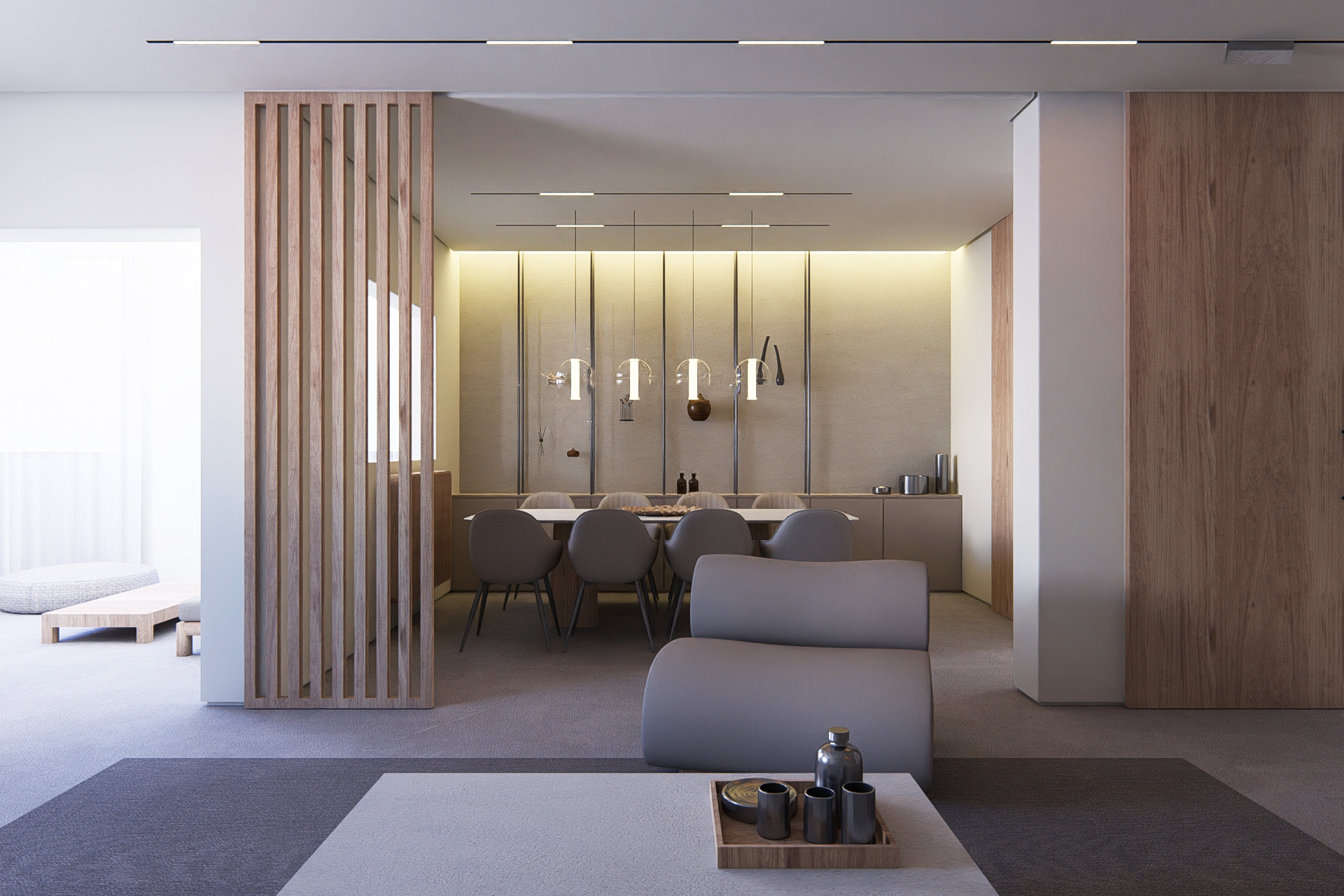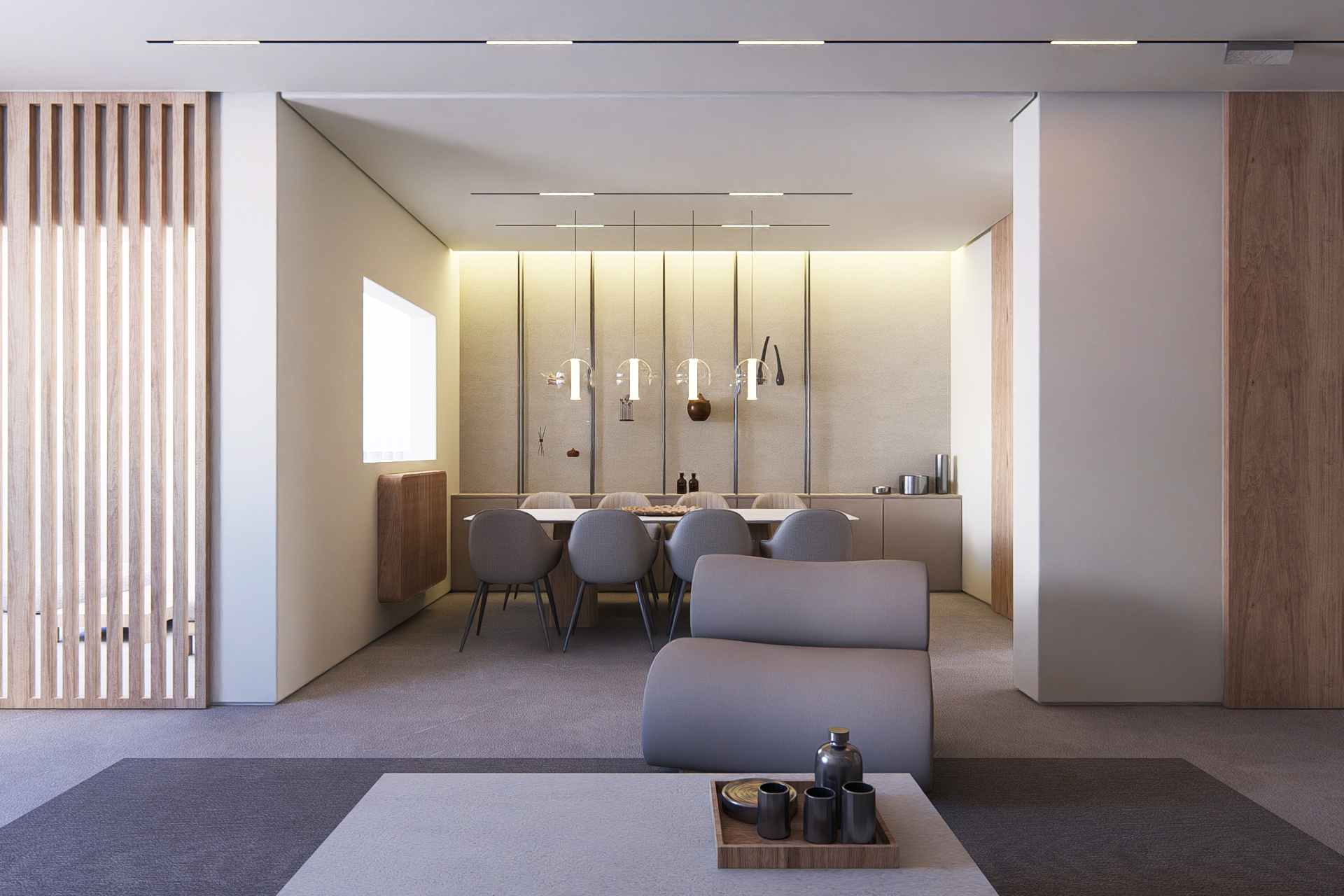 Natural light filters through a palette of warm neutrals, revealing subtle textures in stone, fabric, and wood. The space feels both open and intimate, defined by low, sculptural furniture and thoughtful detailing that invites stillness. Every corner speaks of quiet luxury, where simplicity becomes atmosphere and comfort feels instinctive.
